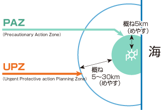 緊急時において、放射性物質または放射線の異常な放出を想定し、周辺環境への影響、周辺地域の皆さまなどに対する放射線被ばくを低減する防護措置を短期間で効率良く行うために、あらかじめ重点的に対策を行う地域が定められています。