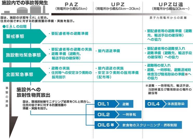 緊急時防護措置を準備する区域 施設から概ね半径30km ※ - 防護措置実施の判断基準となるOIL(運用上の介入レベル)や緊急事態の判断基準となるEAL(緊急時活動レベル)に基づき、屋内退避、安定ヨウ素剤の予防服用等を準備する区域。